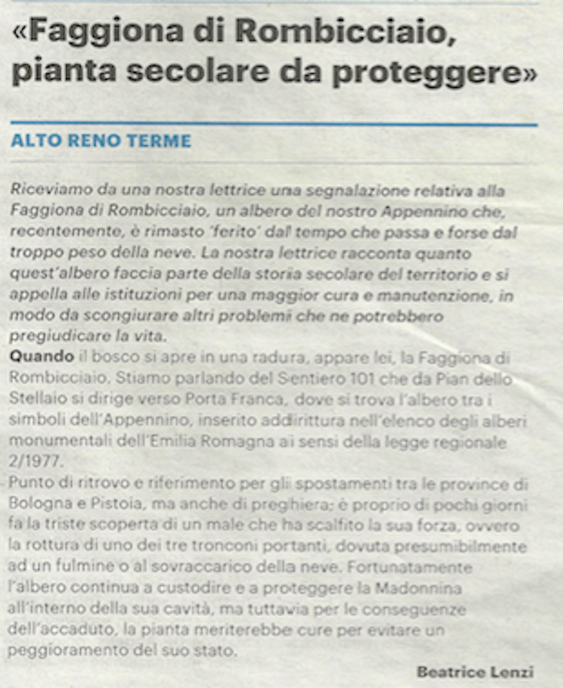 La lettera riguarda la faggiona di Rombicciaio, un grande faggio alto circa 20 metri (tutelato come albero monumantale della nostra regione) che di recente  è stato pesantemente danneggiato dal peso della neve o da una malattia.